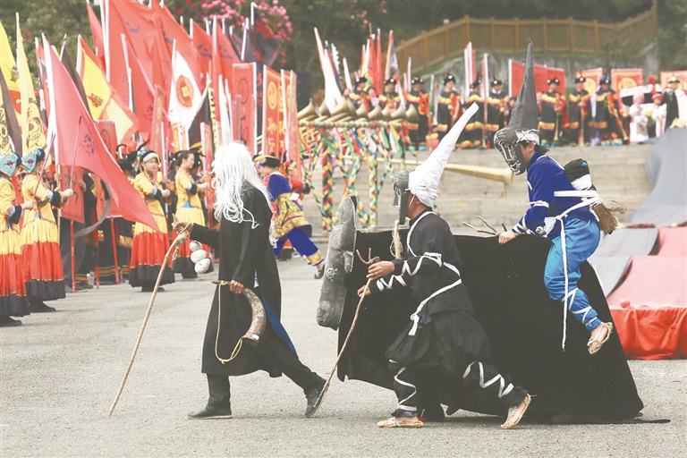 当天,祭祀队伍由布摩方队、高香方队、响器方队(铜锣、镲、大中小号、唢呐、大中小鼓)、神牌方队、彩旗方队、游行方队共700余人组成。