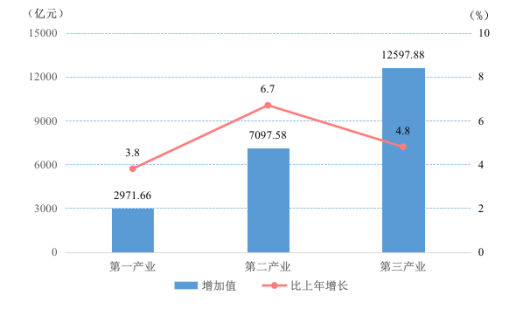 根据地区生产总值统一核算结果,2024年,全年全省地区生产总值22667.12亿元,比上年增长5.3%。其中,第一产业增加值2971.66亿元,比上年增长3.8%,占地区生产总值的比重为13.1%;第二产业增加值7097.58亿元,增长6.7%,占地区生产总值的比重为31.3%;第三产业增加值12597.88亿元,增长4.8%,占地区生产总值的比重为55.6%。全年人均地区生产总值58685元,比上年增长5.2%。