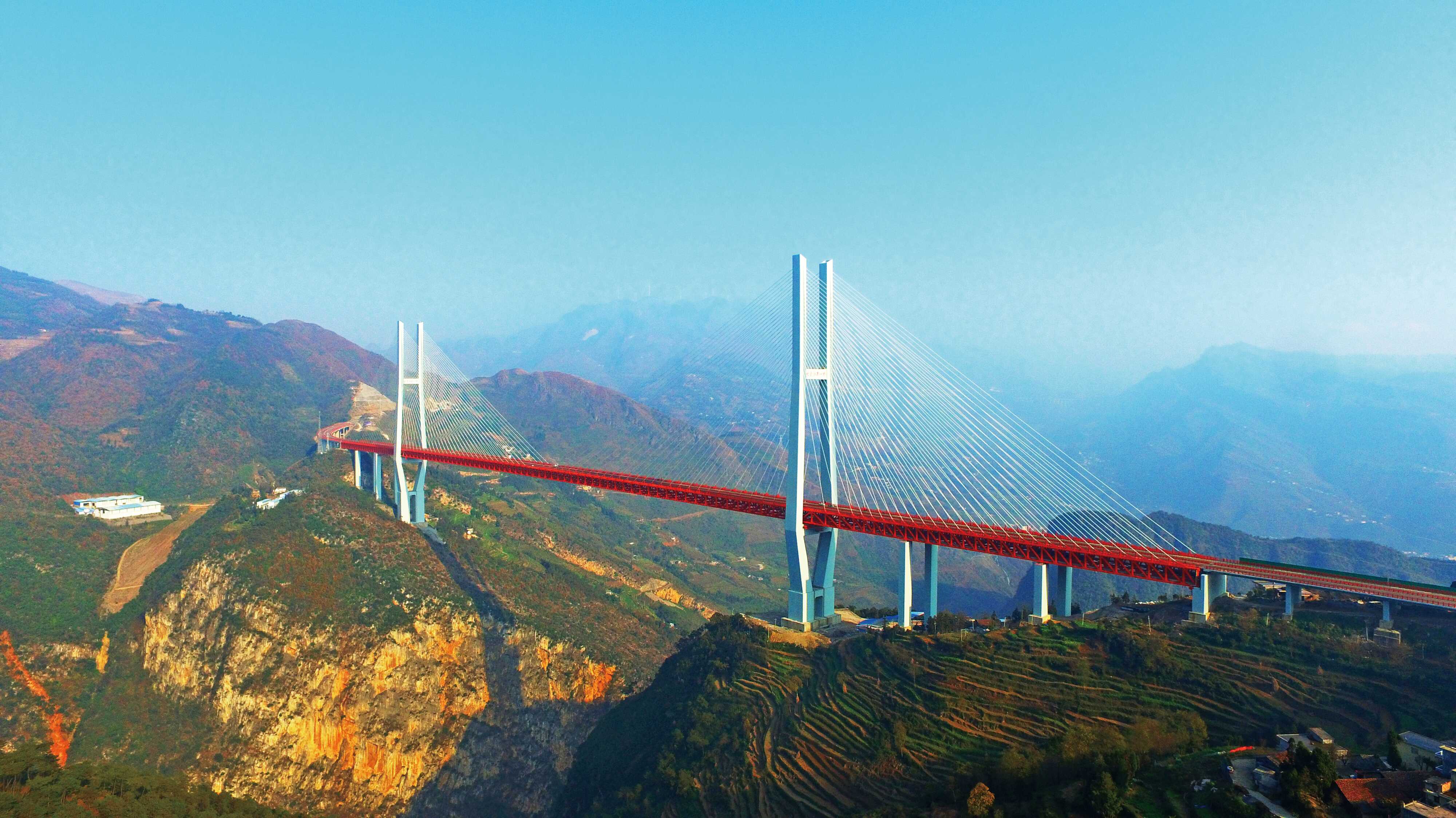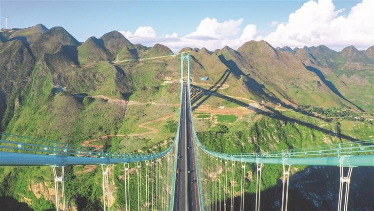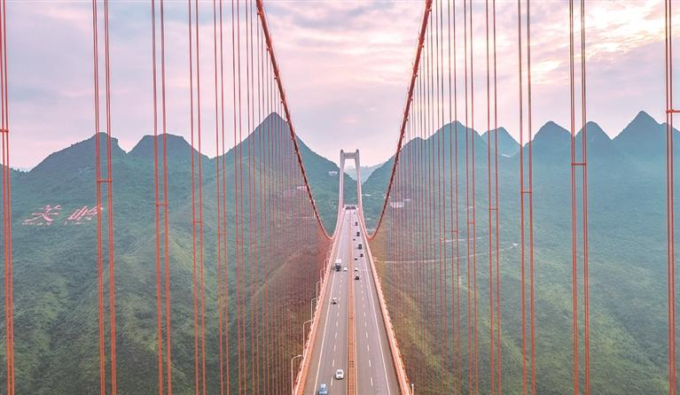 世界“横竖”第一大桥:花江峡谷大桥。2022年1月开工,2025年9月通车。位于贵州省安顺市与黔西南州交界处,是六安高速公路控制性工程,横跨“地球裂缝”花江大峡谷。大桥为单跨钢桁梁悬索桥,全长2890米,主跨1420米,桥面距水面垂直高度625米,为世界第一高桥和山区桥梁跨径第一桥。大桥所在的六安高速,北接都香高速、南连汕昆高速,与沪昆高速交汇,是贵州连接北部湾港口、成渝地区双城经济圈和粤港澳大湾区的重要陆路通道,将有力提升西部地区协同发展与对外开放水平