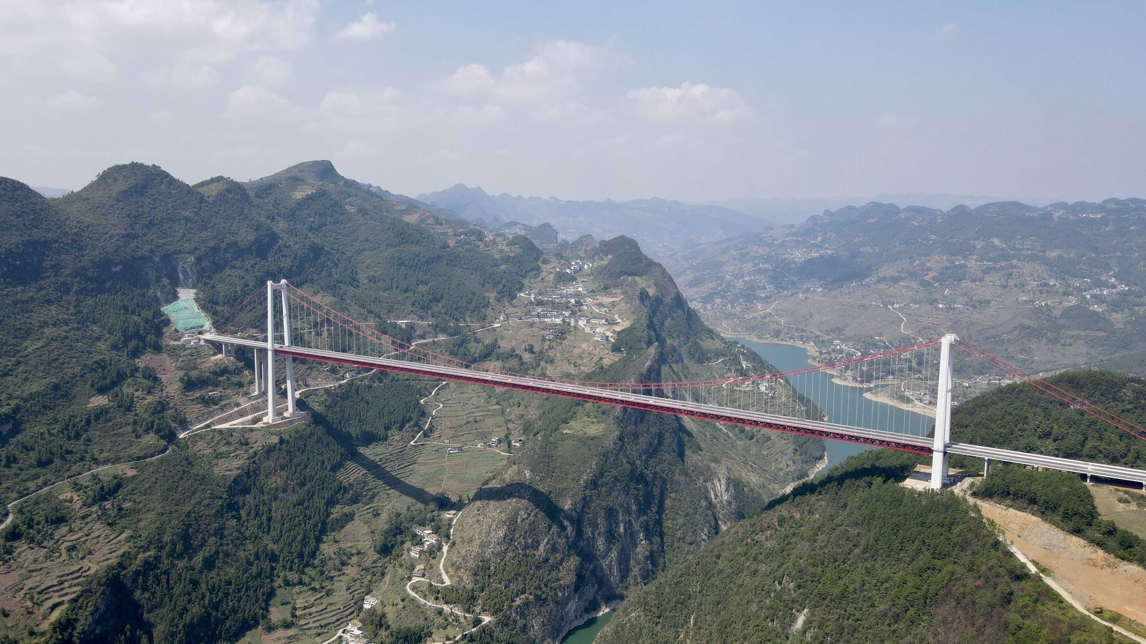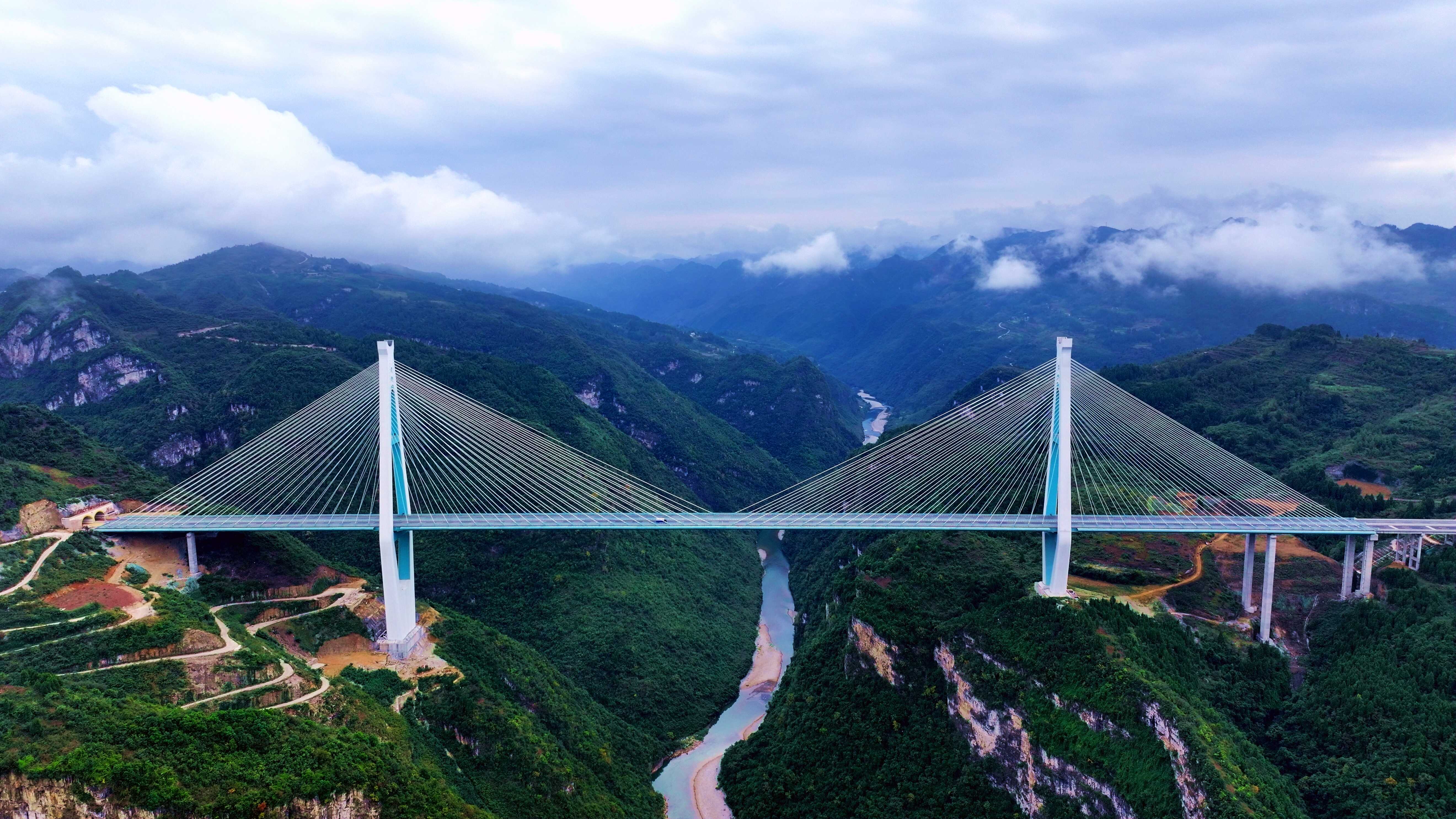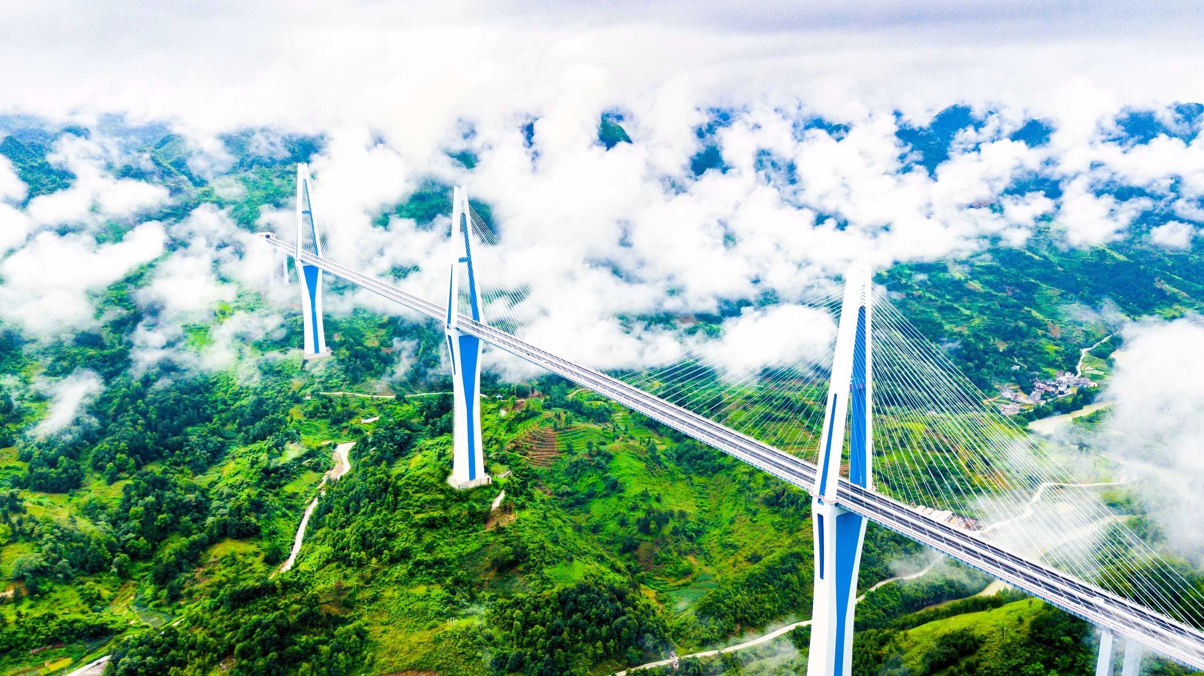 坝陵河大桥。位于沪昆高速公路镇宁至胜境关段。2005年4月开工,2009年12月建成,全长2237米、主跨1088米、最高桥墩202米、桥高370多米,是世界首座山区峡谷千米级跨径桥梁。获中国建设工程鲁班奖特等奖