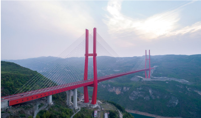 贵黔高速鸭池河大桥。2014年8月动工建设,2016年7月16日建成通车。大桥全长1450米,主跨800米,桥高434米。建成时,钢桁梁斜拉桥跨径和桥面高度分别排名世界第一和第五。2018年5月,获第35届国际桥梁大会“古斯塔夫·林德撒尔奖”