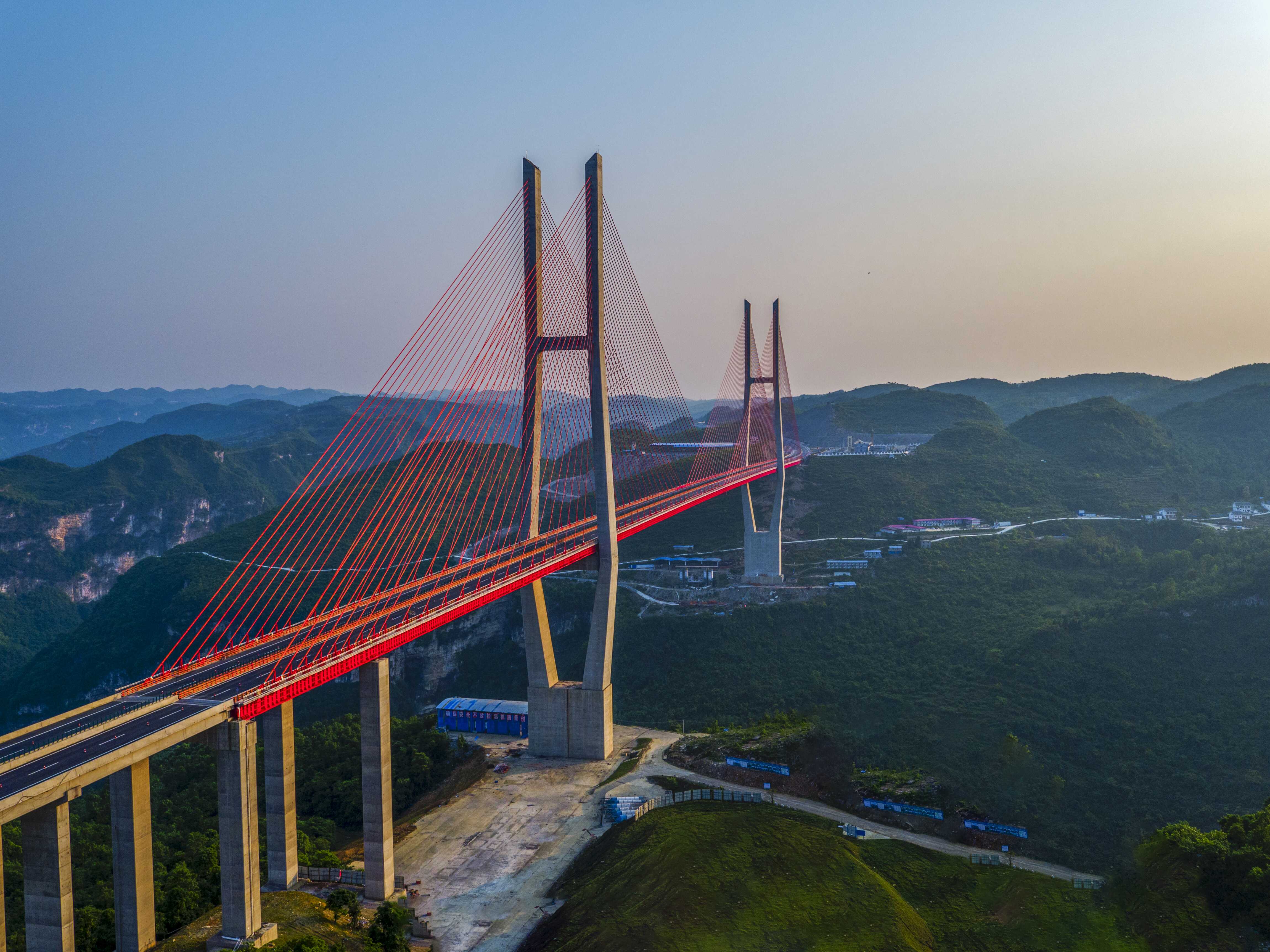 世界最高混凝土桥塔:平塘至罗甸高速公路特大桥中塔。大桥全长2135米,中塔塔高332米,为山区最大跨径的三塔斜拉桥,创下了“世界最高混凝土桥塔”的世界记录。桥塔造型融入当地少数民族独有的服饰、舞蹈等元素,与周边的自然景观相互映衬,被誉为“天空之桥”。大桥包揽2021年第38届国际桥梁大会“古斯塔夫·林德撒尔奖”、国际咨询工程师联合会(FIDIC)全球工程项目“杰出奖”和国际桥梁与结构工程协会“杰出结构奖”三项大奖,是继港珠澳大桥之后唯一实现包揽三大奖项的国内桥梁项目。