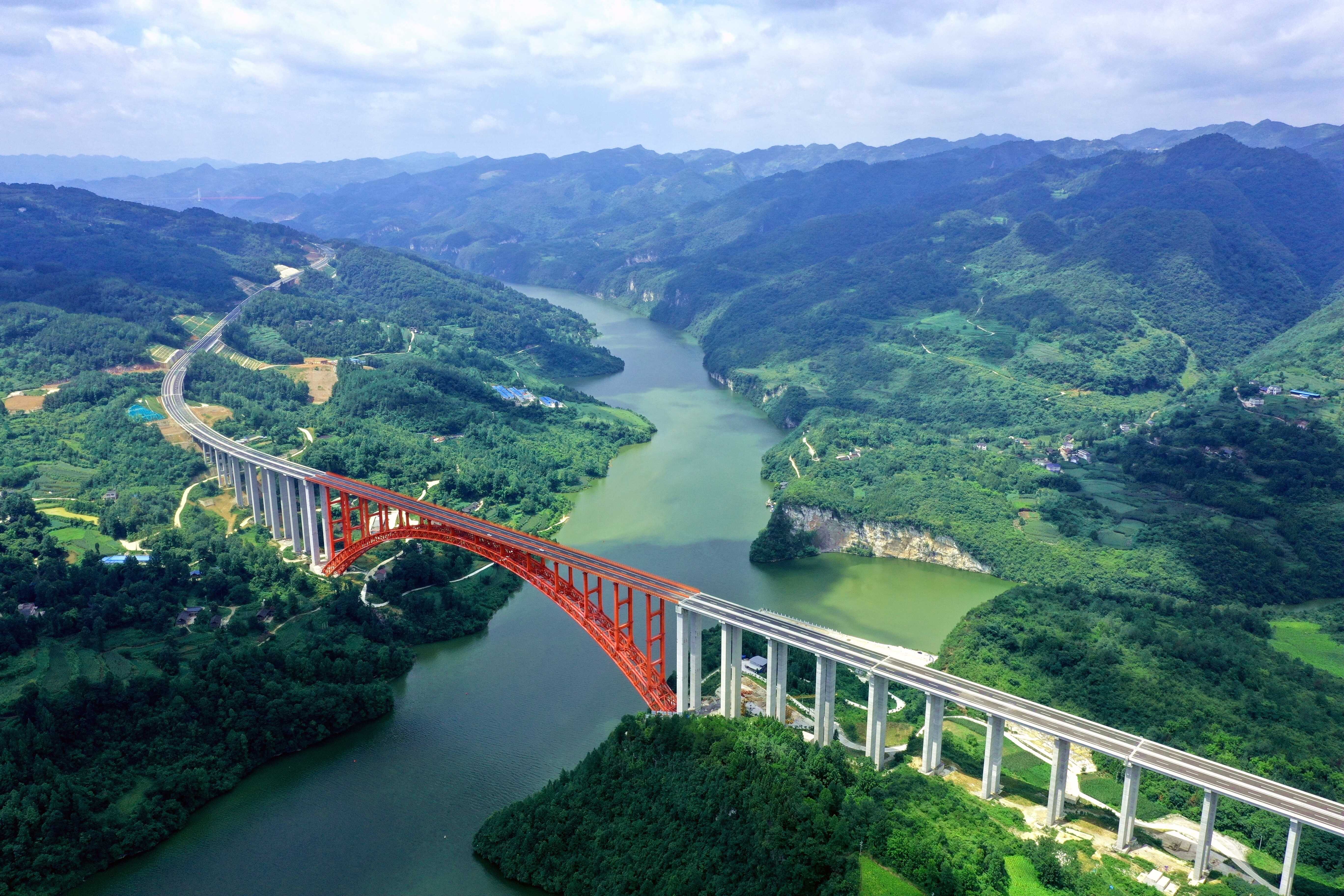 德余高速乌江大桥。2023年7月建成通车。全长1834米,主桥504米。大桥采用国内首创的拱、柱、梁全固结无支座整体式受力体系,全桥主拱、立柱和桥面梁等结构均通过高强度螺栓连接,结构新、精度严,施工难度居世界同类型桥梁前列,是世界最大跨径上承式钢管混凝土拱桥