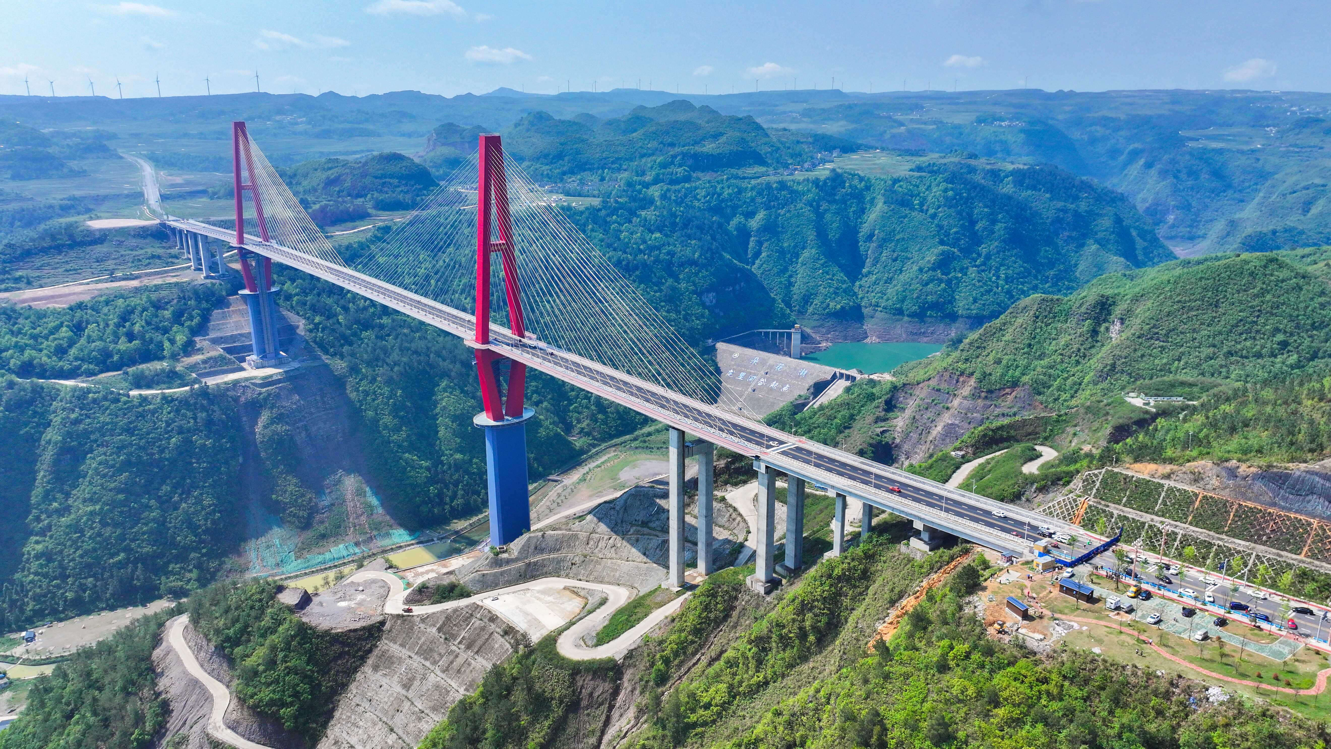 龙里河大桥。位于贵州省黔南州龙里县,横跨朵花大峡谷,2024年4月通车,全长1260米,主跨528米,塔顶距峡谷底约400米,桥面距峡谷底约280米,是龙溪大道延伸至景区的控制性工程,是世界首座车行道与玻璃步道共桥面的高山峡谷景观斜拉桥,兼具交通与旅游功能。