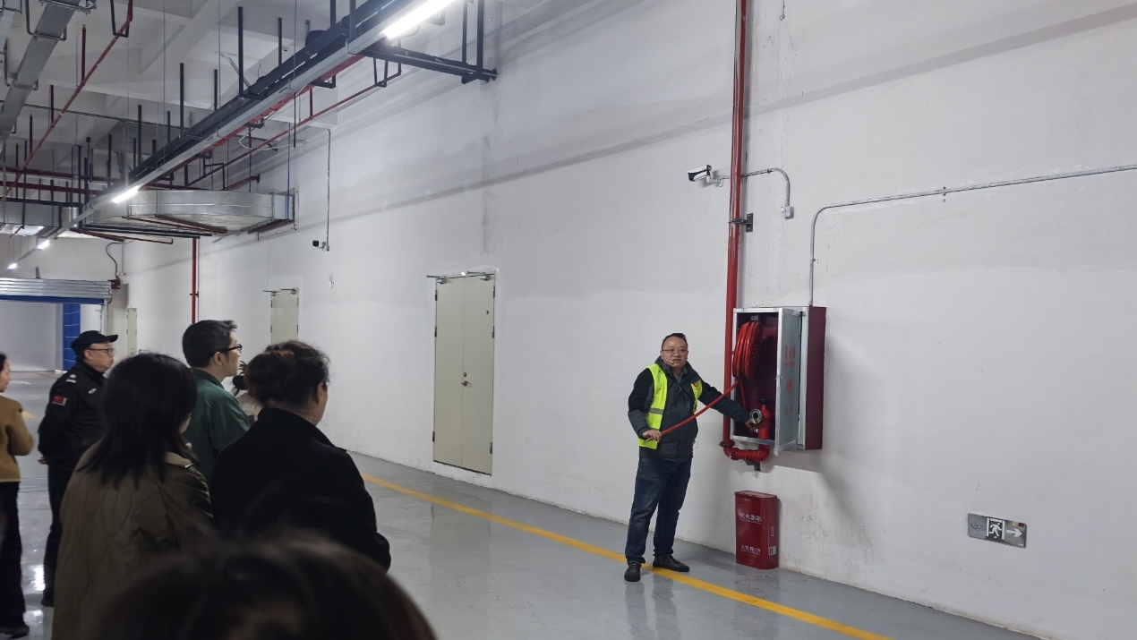 实操演练环节,现地讲解消防卷盘软管的操作流程、常闭式防火门启闭方法及日常维护要点,分组进行实际操作。