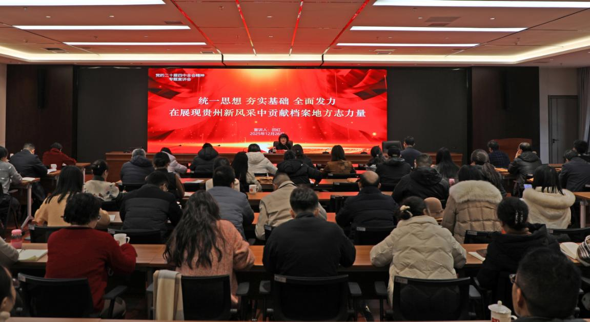 2025年12月26日,贵州省档案馆(省地方志办)副馆长(副主任)田红向分管处(室)党员干部宣讲党的二十届四中全会精神。