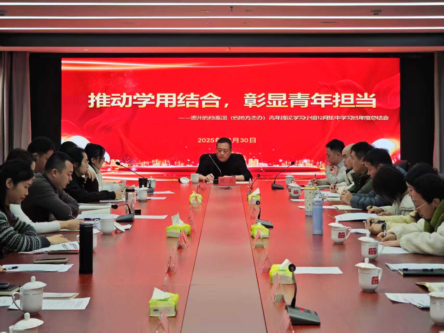 为推动学习贯彻党的二十届四中全会精神走深走实,2025年12月30日,省档案馆(省地方志办)青年理论学习小组以“推动学用结合,彰显青年担当”为主题,组织召开12月份集中学习暨年度总结会,馆长(主任)代兵出席会议并提工作要求。